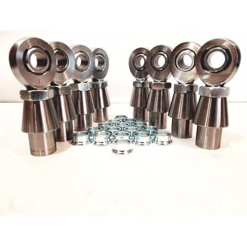 This 7/8"-14 to 3/4" bore rod end kit includes four right-hand and four left-hand chromoly rod ends, each with a 3/4" (.750) bore, .875" ball width, and a 7/8"-14 thread, built from 4130 chromoly with a Teflon Kevlar liner for enhanced durability and a radial load rating of 55,692 lbs. The kit also features four RH and four LH jam nuts, eight 2-5/8" long x 1-3/4" wide tube adapters (RH and LH) designed to fit 1.5" OD x .120 wall tubing or 1.25" ID holes, along with 16 stainless steel cone spacers for precise alignment and fitment.
