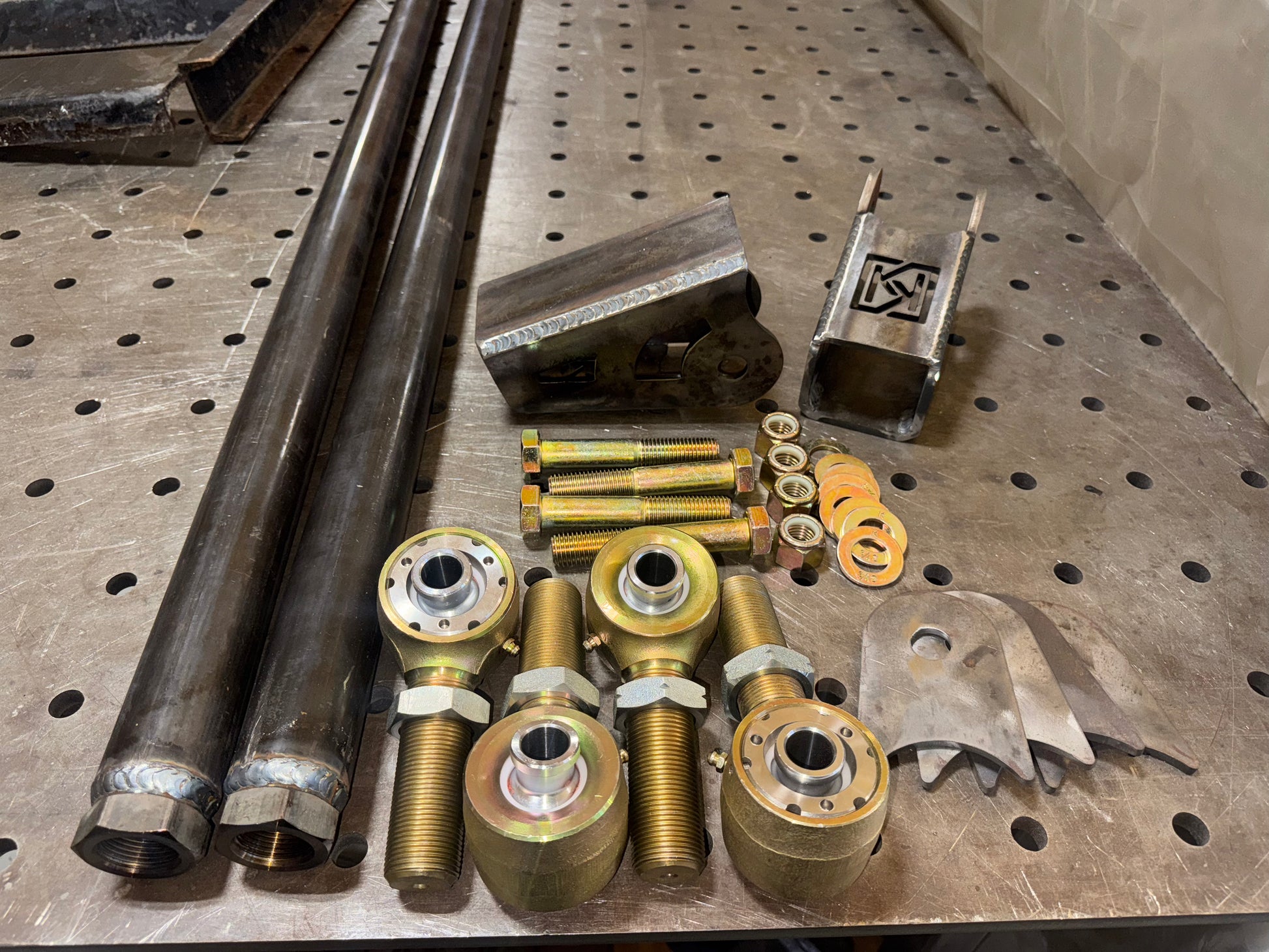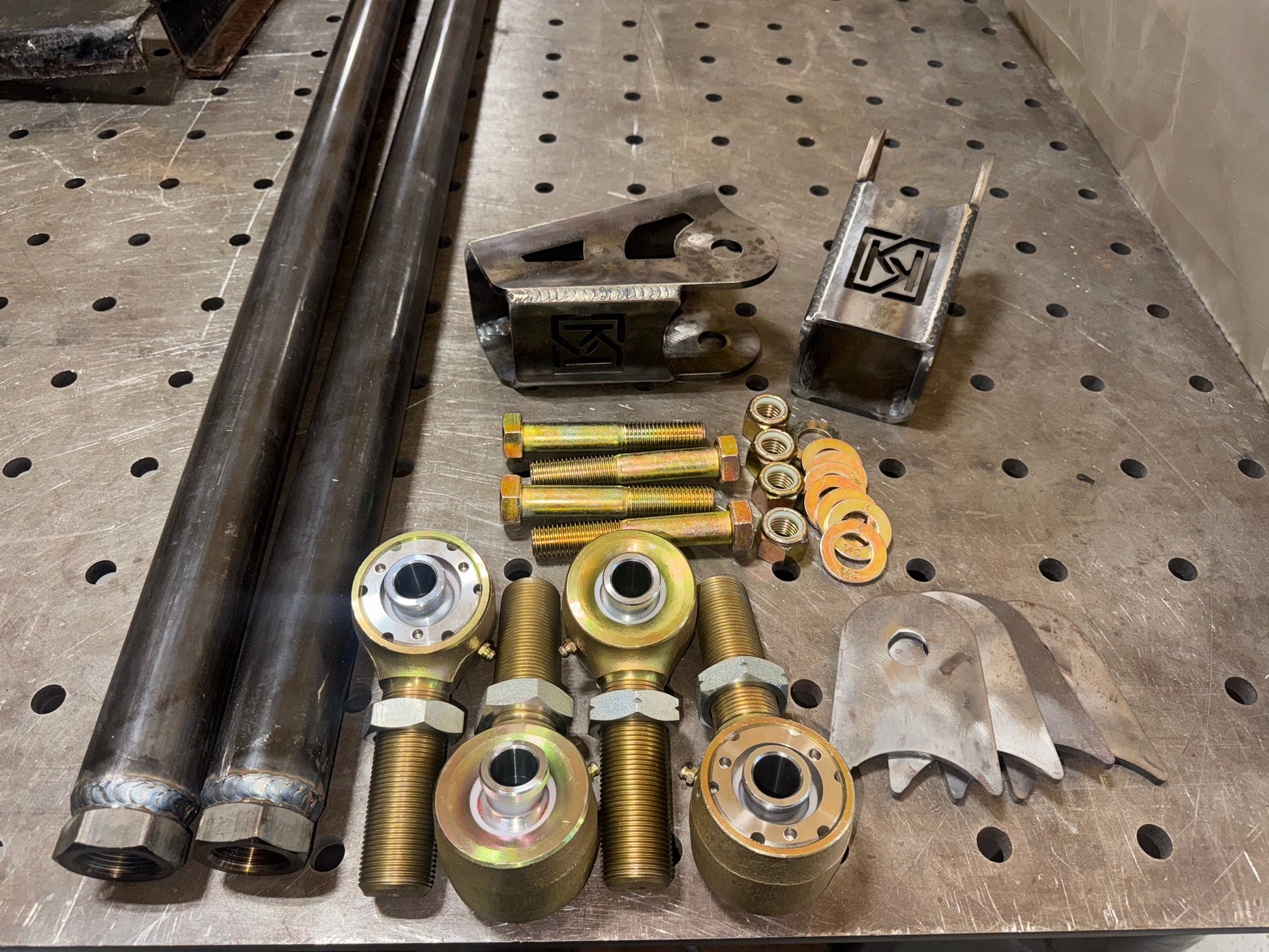 Full hardware kit with heim joints, spacers, and grade 8 bolts